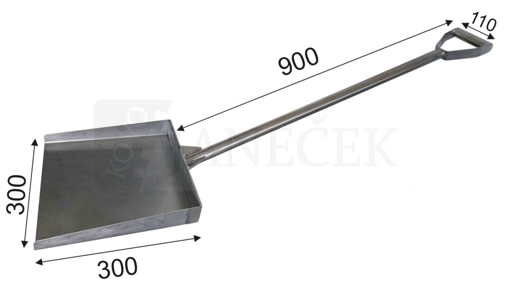 Nerezová lopata z potravinářské nerezi na manipulaci s masem nebo čímkoliv jiným. Plocha na nabírání z nerezového plechu 1,5 mm, velikost 300x300 mm. Délka násady je 900 mm, násada z nerezové trubky. Nerezová ručka z trubky na konci násady, šířka ručky 110 mm. Váha 3 kg.
